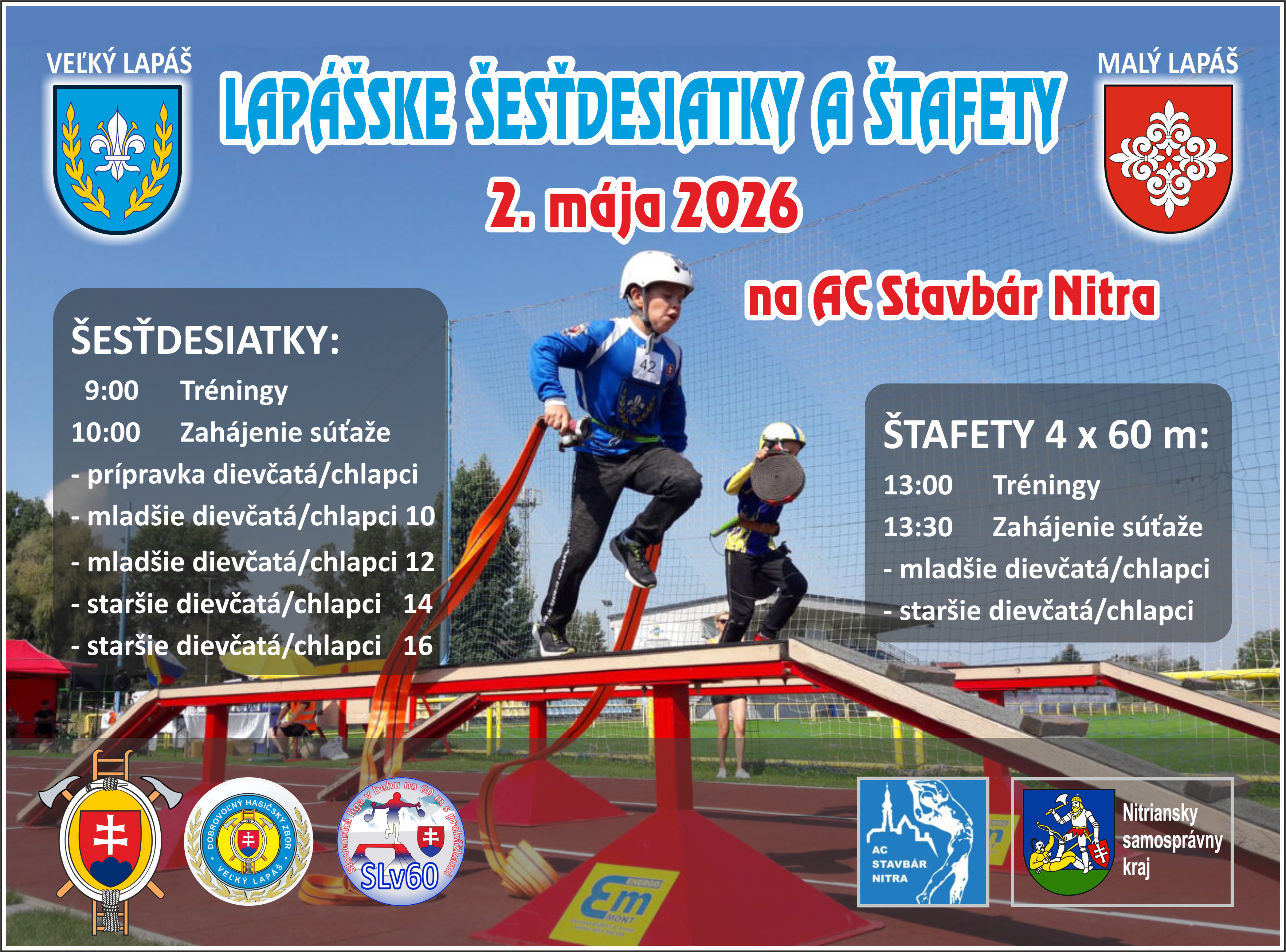 Obec Veľký Lapáš a Obec Malý Lapáš v spolupráci s DHZ Veľký Lapáš, DHZ Malý Lapáš Vás pozývajú na 1. kolo XIII. ročníka súťaže mladých hasičov Slovenskej ligy v behu na 60 metrov s prekážkami a Slovenskej ligy v štafete 4x60m s prekážkami.