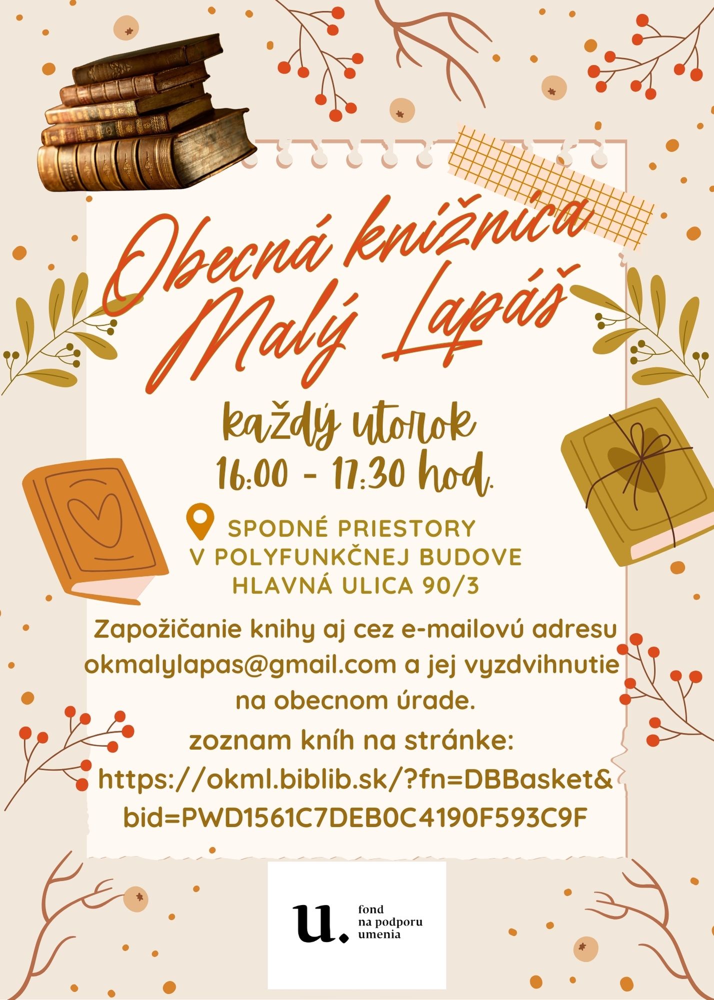 Pozývame Vás do novootvorenej Obecnej knižnice Malý Lapáš každý utorok od 16:00 do 17:30 hod. v spodných priestoroch polyfunkčnej budovy - Hlavná ulica 90/3, Malý Lapáš.